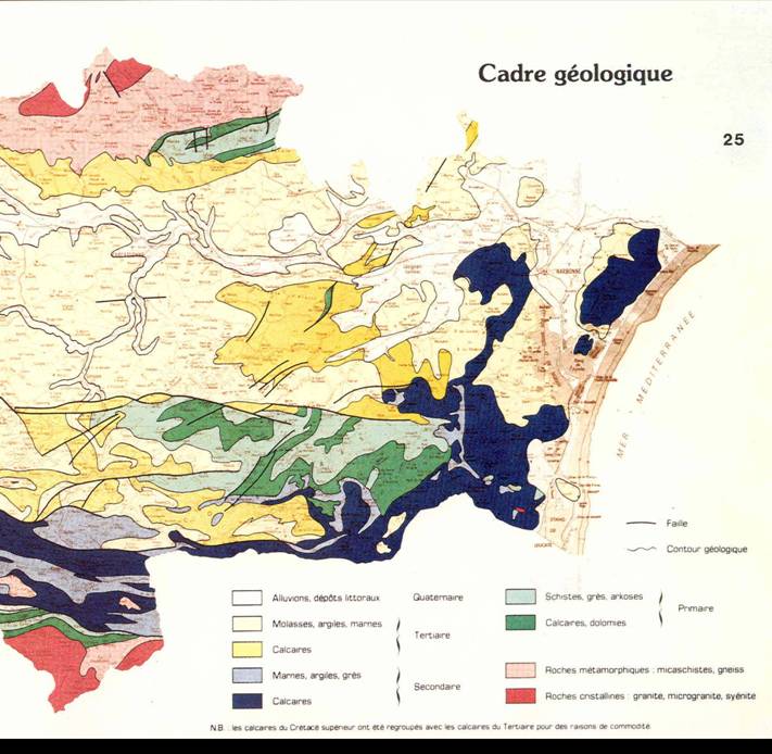 jusqu'à la montagne de la Clape, sont constitués de calcaires hérités de
