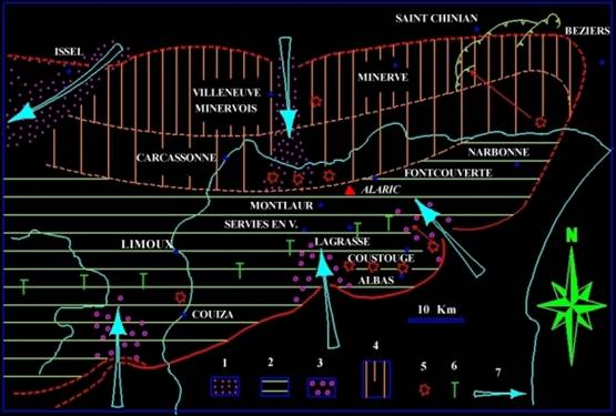 retrouvent dans les Pyrénées, le massif de Mouthoumet au centre des