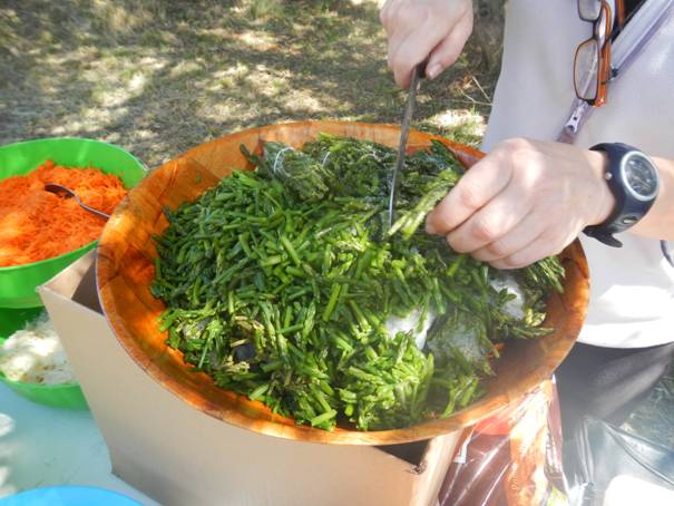 Après avoir ramassé et lavé les asperges, celles-ci sont tronçonnées